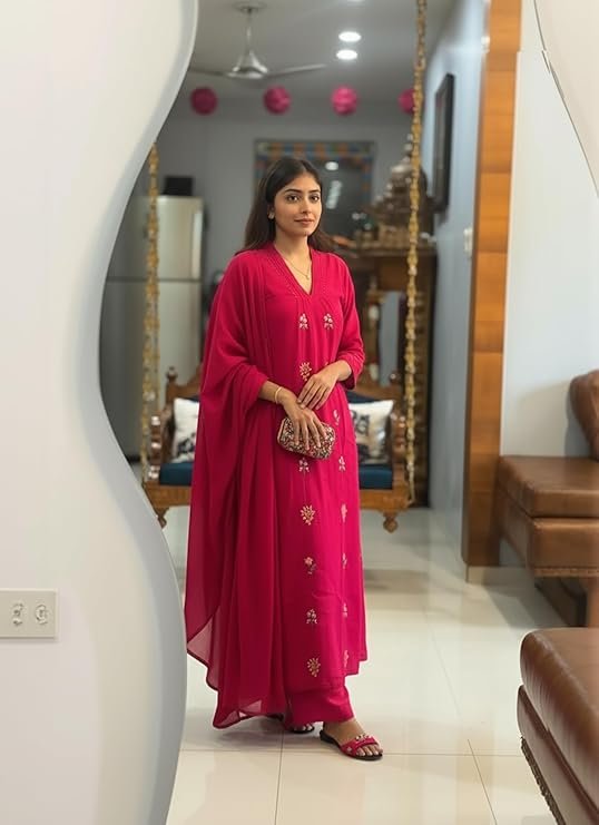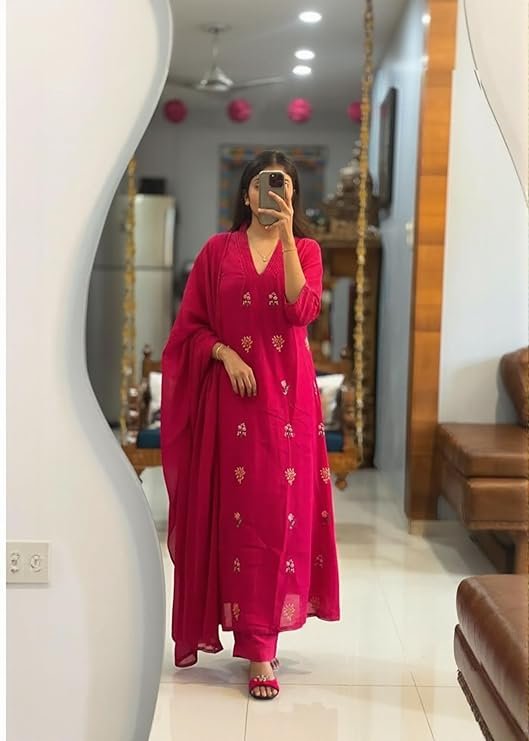 - This set includes 1 kurta and 1 pant with dupatta. Work: Embroidered || Neck Style: V-Neck