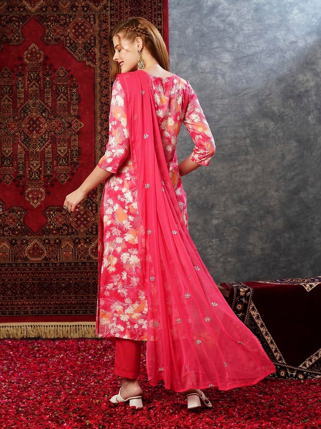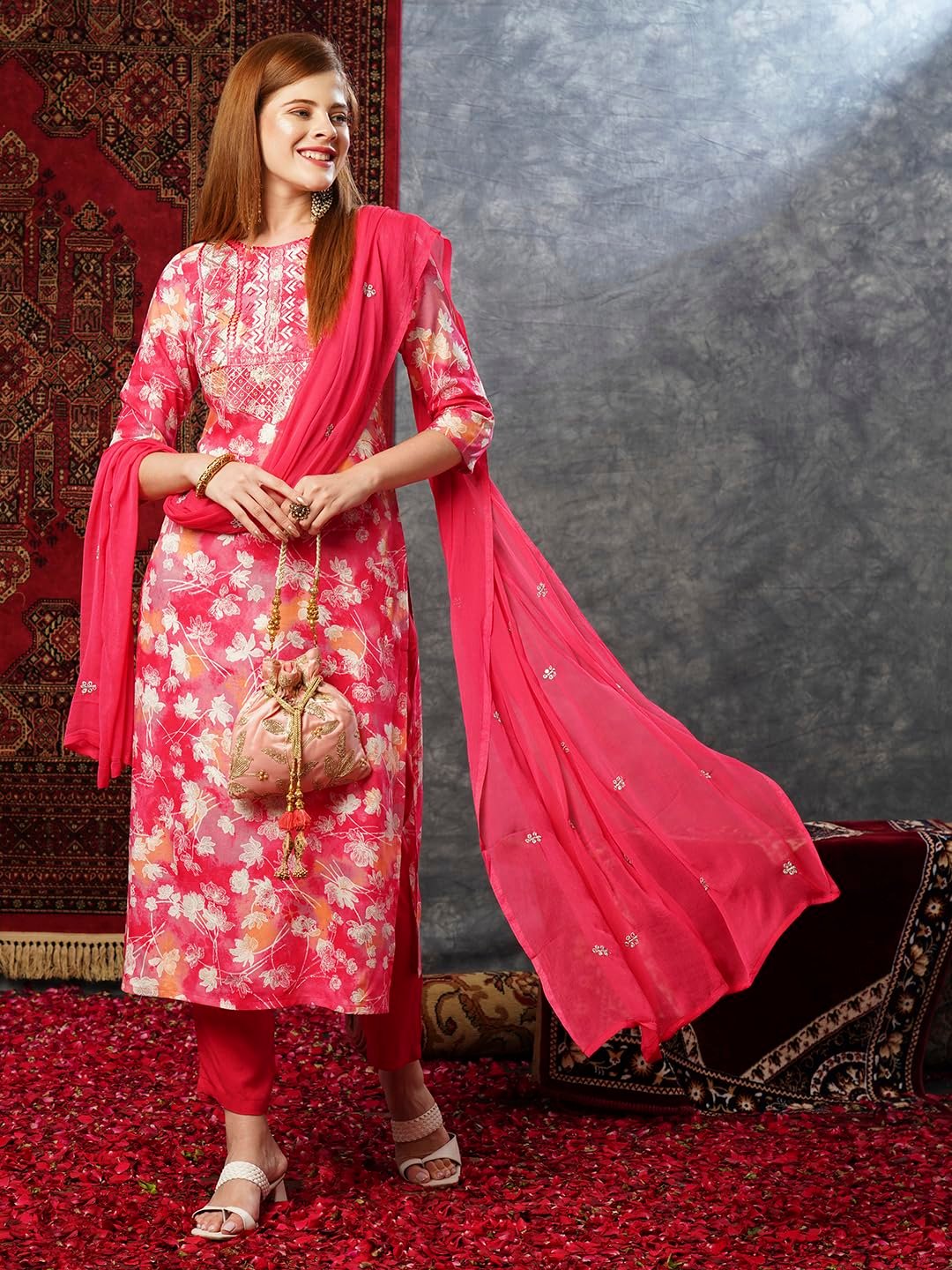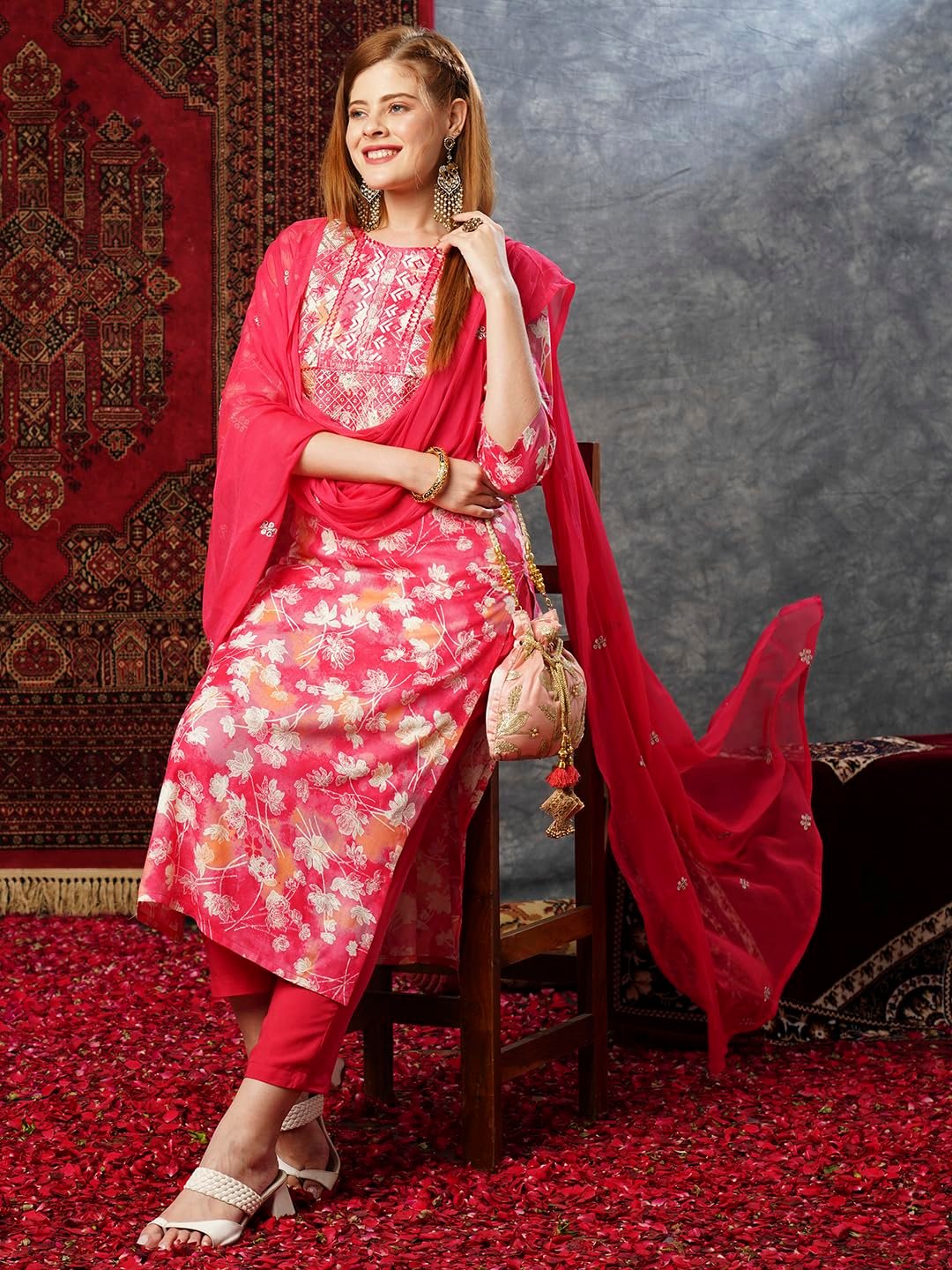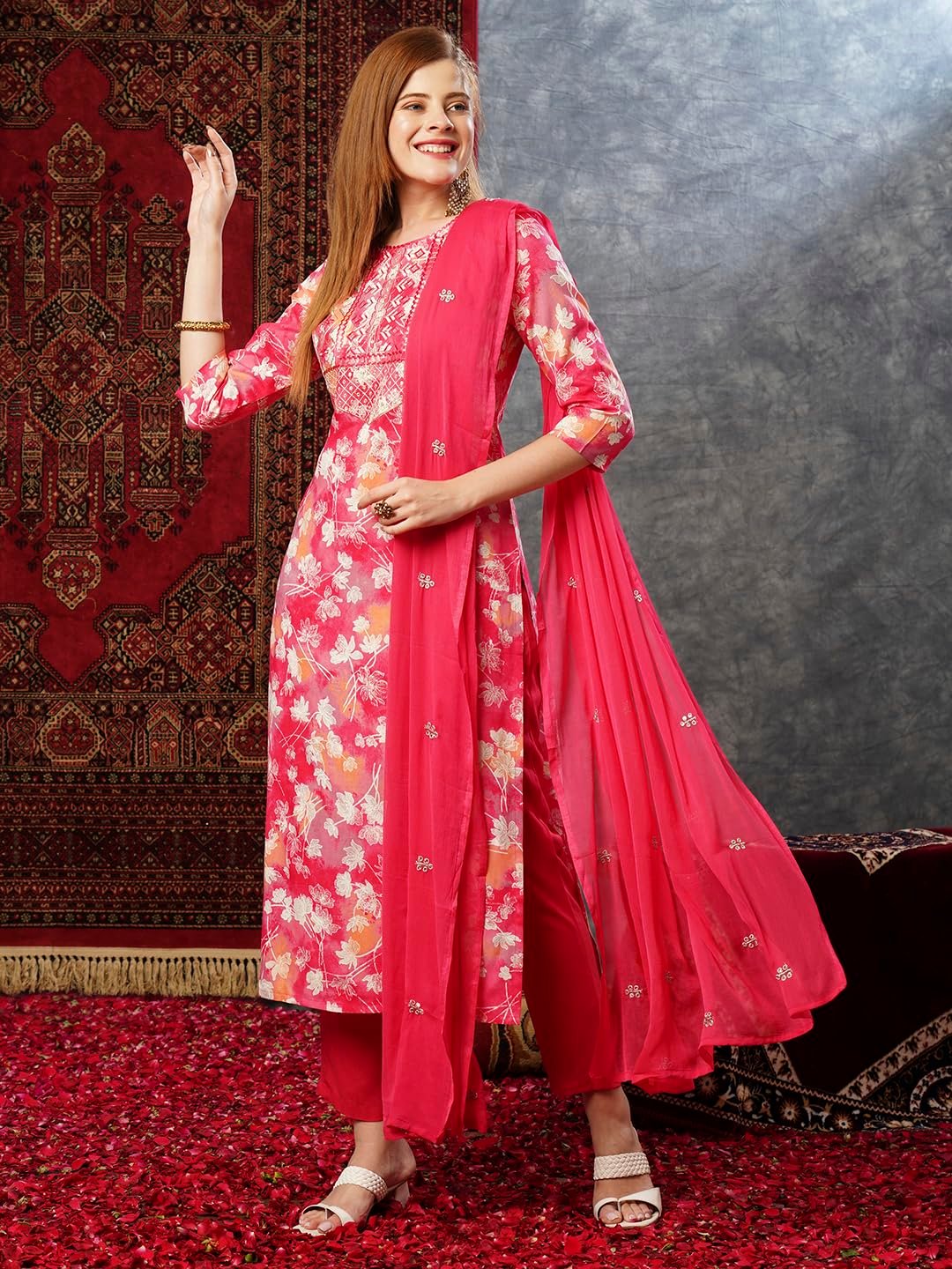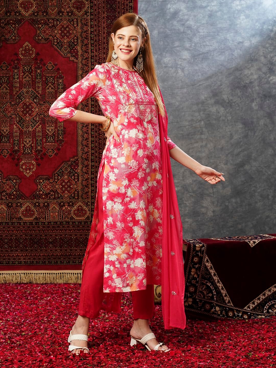 - This set includes 1 kurta and 1 Pant with dupatta. Work :- Printed & Embroidered Neck Only || Neck Style: – Round Neck