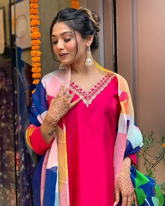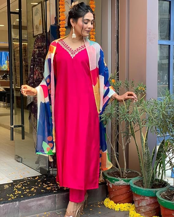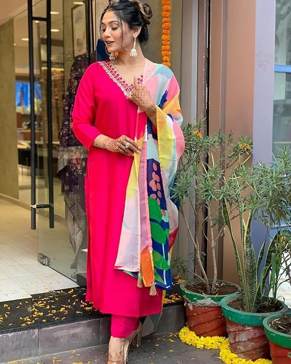 • This set includes: 1 Kurta and 1 Pant with Dupatta Printed || Work :- Solid & Embroidered Neck Stone || Neck Style:- V-Neck