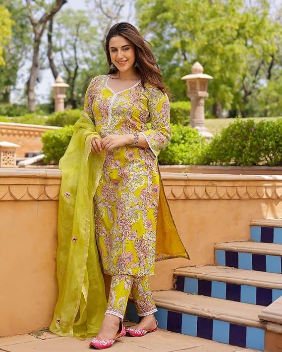 - This set includes: 1 Kurta and 1 Pant with Dupatta || Work :- Printed || Neck Style:- Round Neck