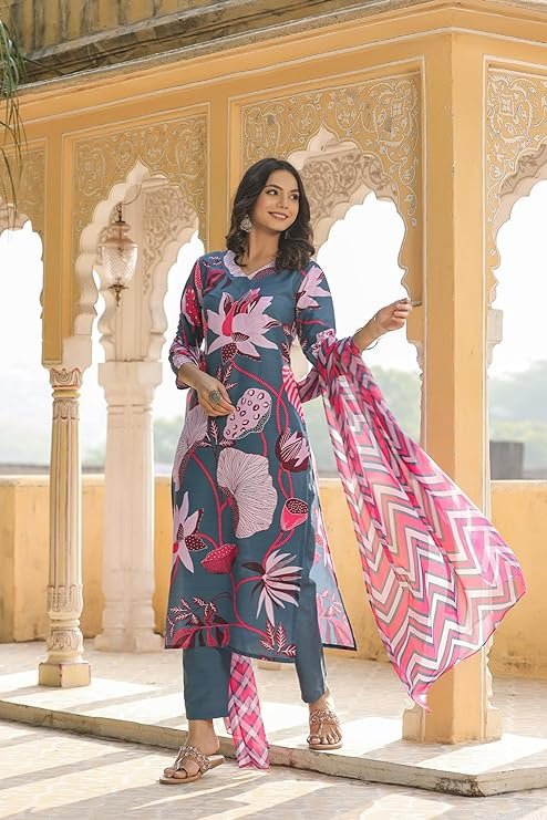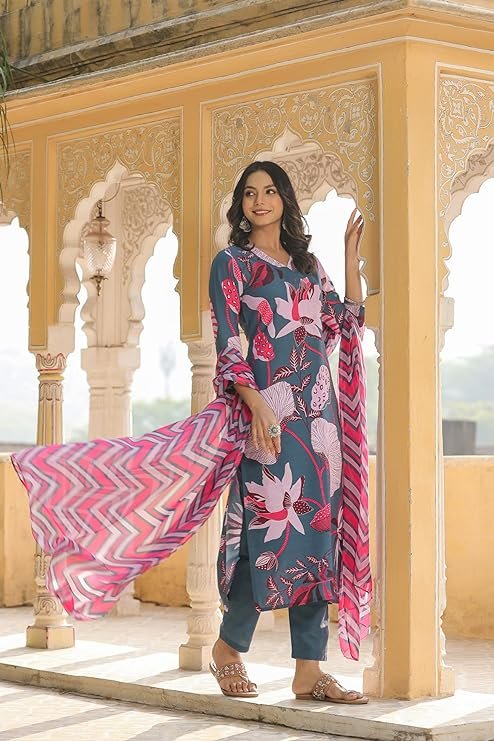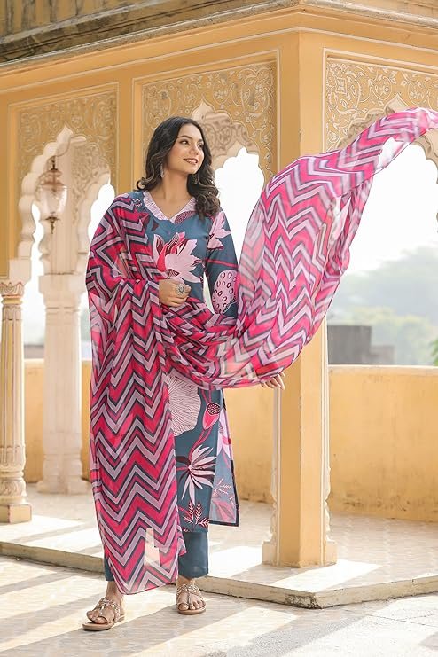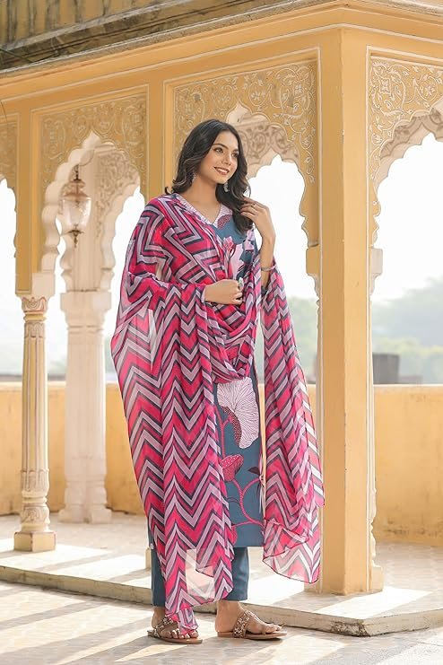 - This set includes: 1 Kurta and 1 Pant with Dupatta || Work :- Printed || Neck Style:- V-Neck
