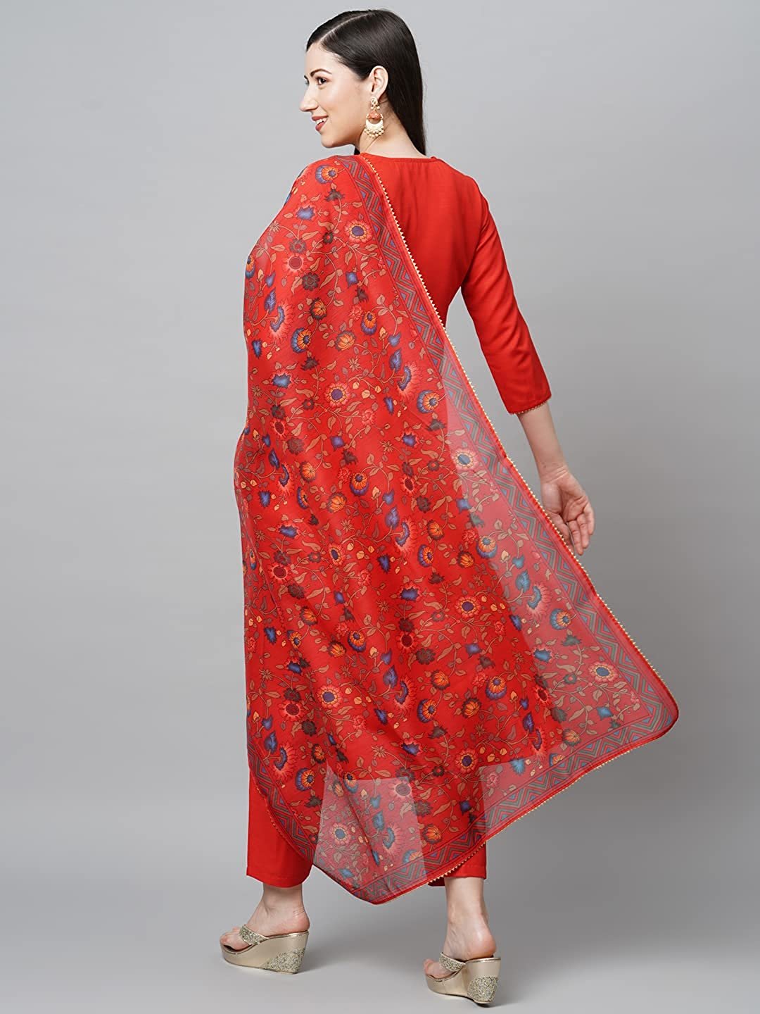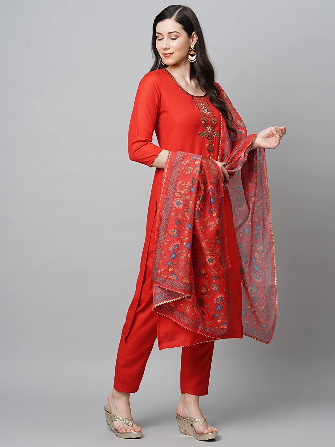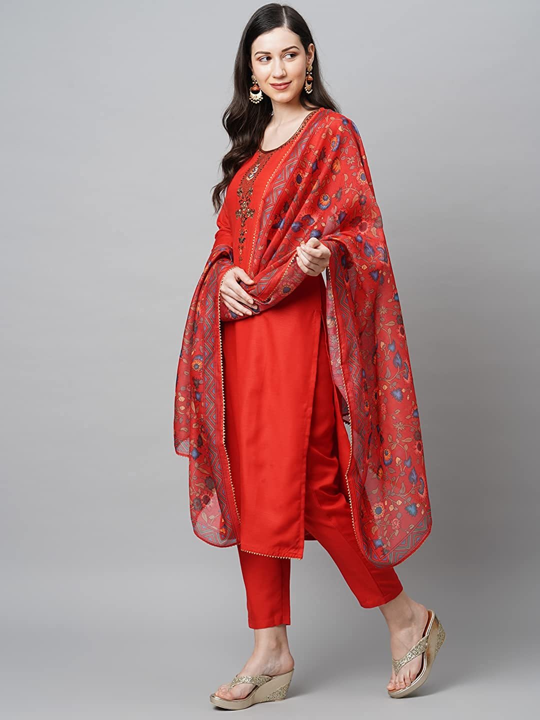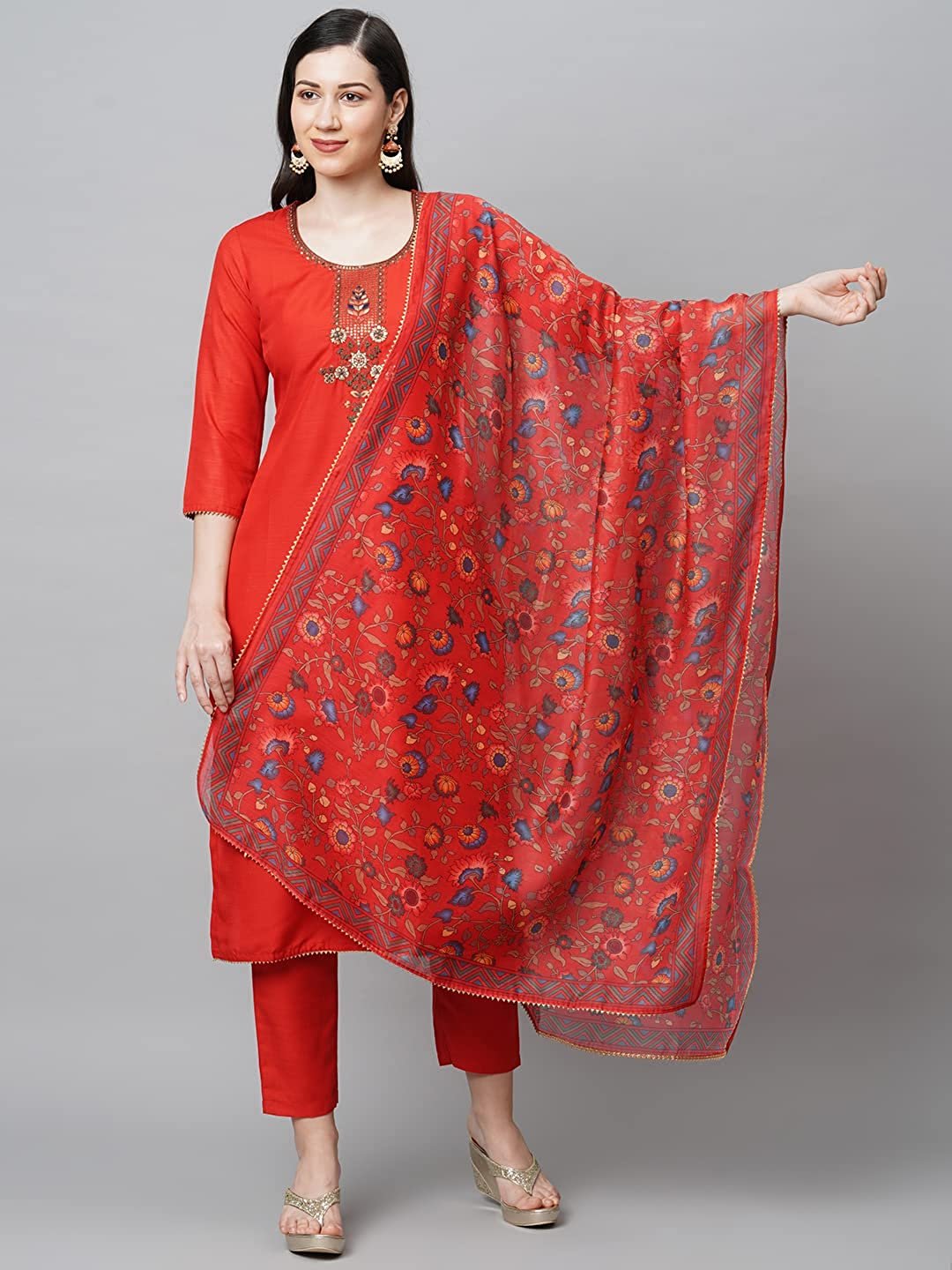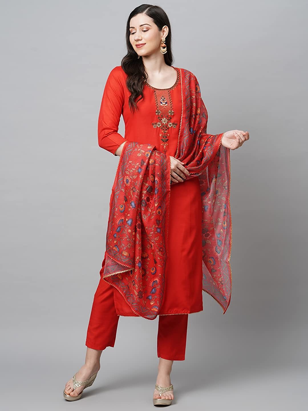 - This set includes 1 Kurta and 1 Pant with Dupatta || Work:- Embroidery Work Chest Only and Dupatta Printed || Neck Style:- Round Neck