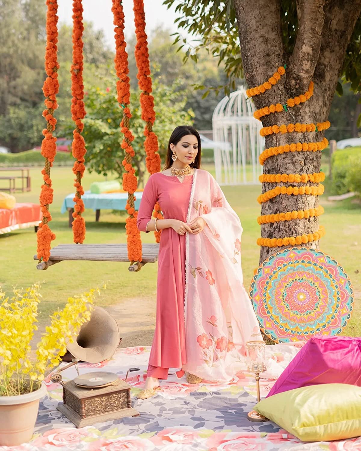 - This set includes: Kurta & Pant With Printed Dupatta || Neck Style: V-Neck
