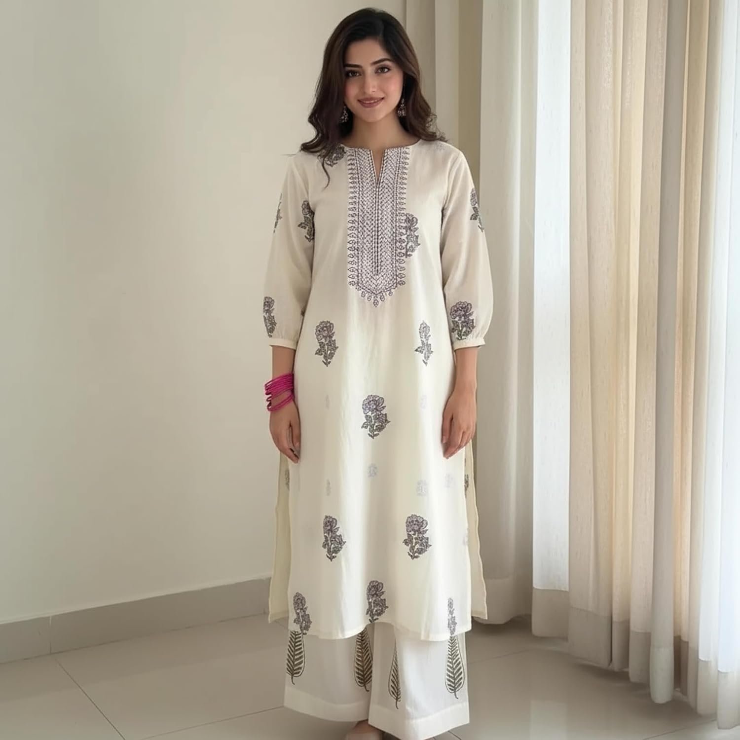 - Style: Straight || Length: Calf Length || Sleeves: 3/4 Sleeve || Size Chart—Kurta—S-36 in, M-38 in, L-40 in, XL-42 in, XXL-44 in, Palazzo: – S-28 in, M-30 in , L-32 in, XL-34 in, XXL-36 in, For more, please refer to the size chart below.