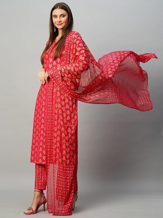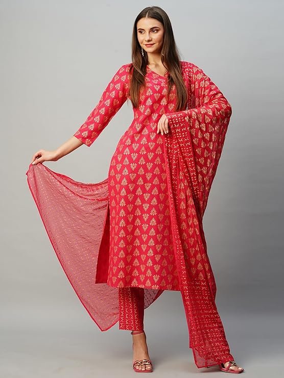 Type: Women’s Cotton Blend Straight Printed Kurta with Pant & Dupatta