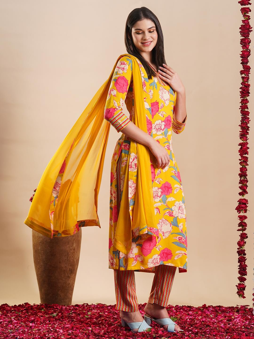 • This set includes: 1 Kurta and 1 Pant with Dupatta || Work :- Printed || Neck Style:- V-Neck