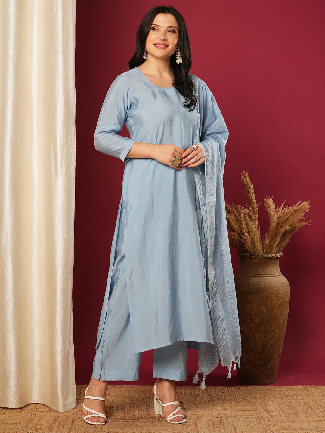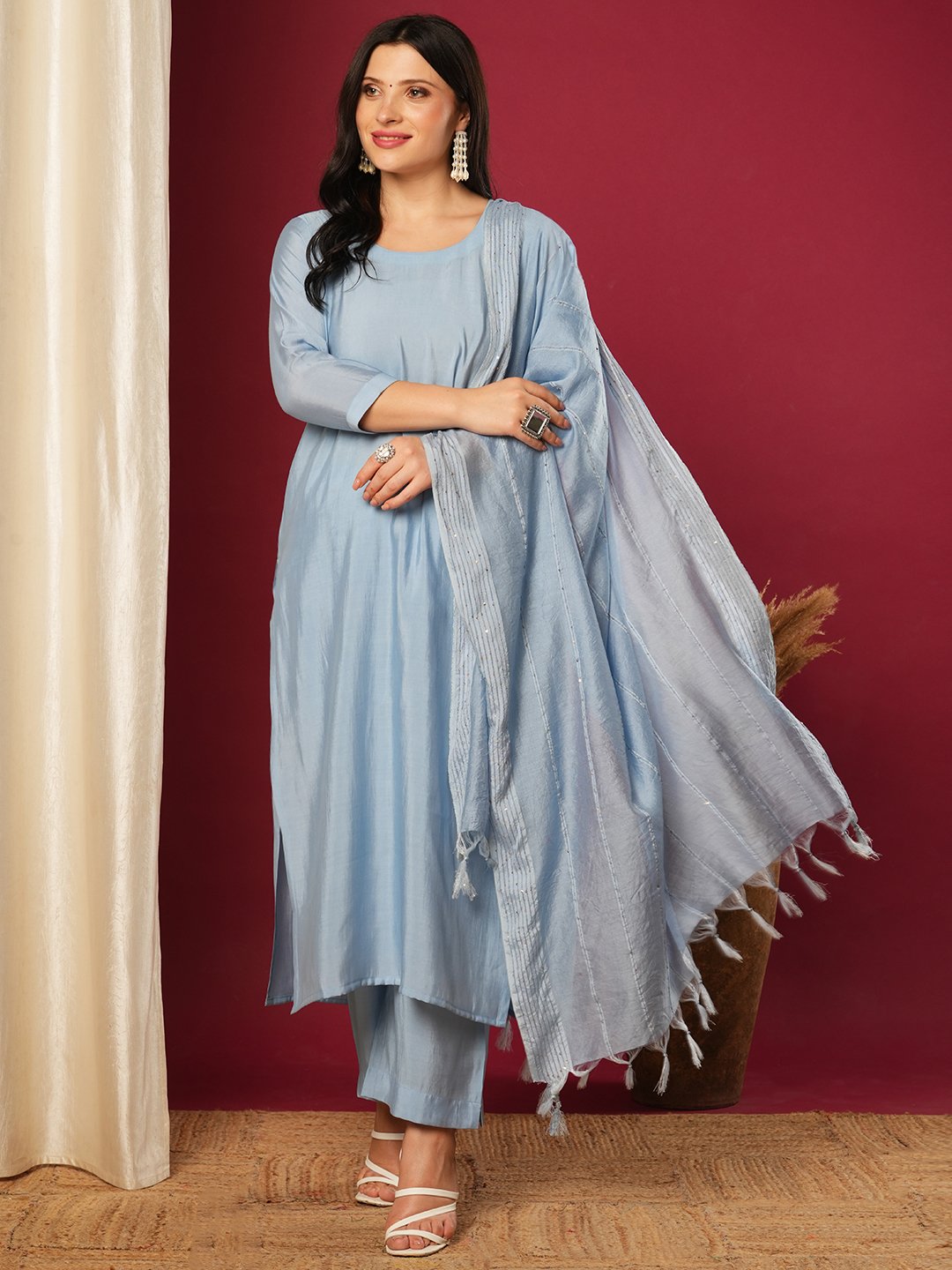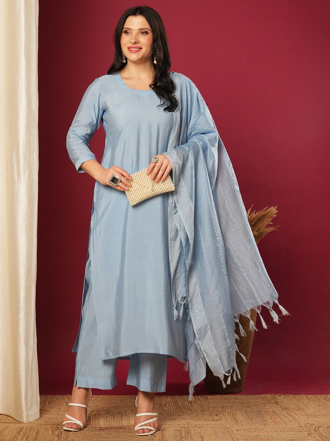 - This set includes: 1 Kurta and 1 Pant with Dupatta || Neck Style:- Round Neck.