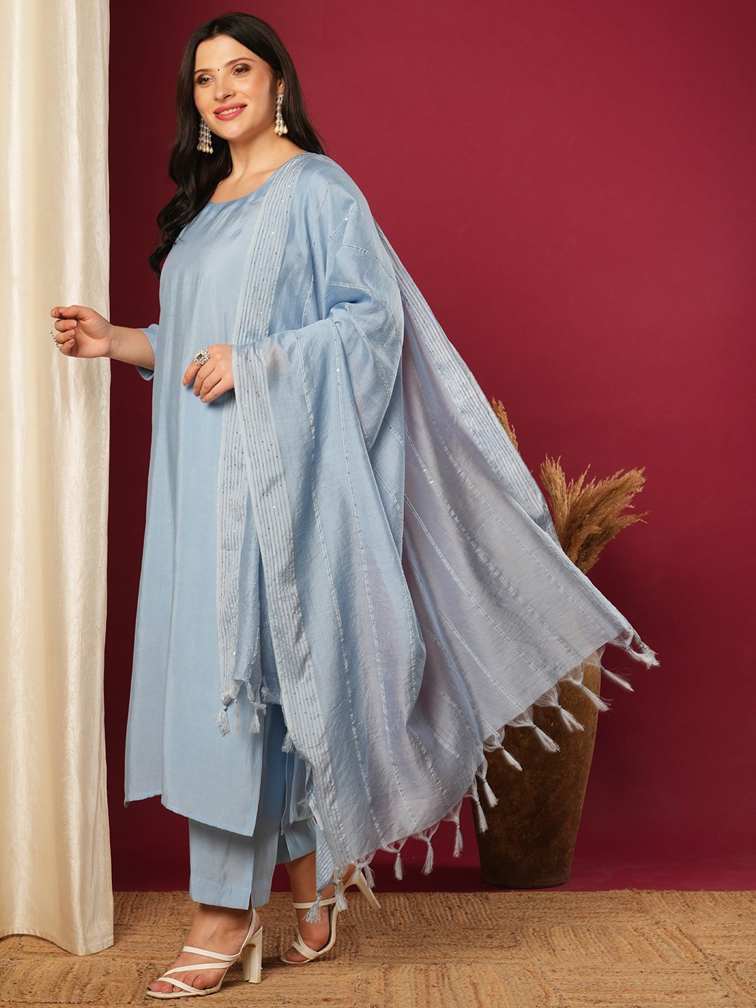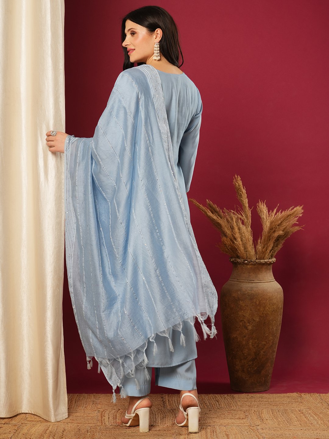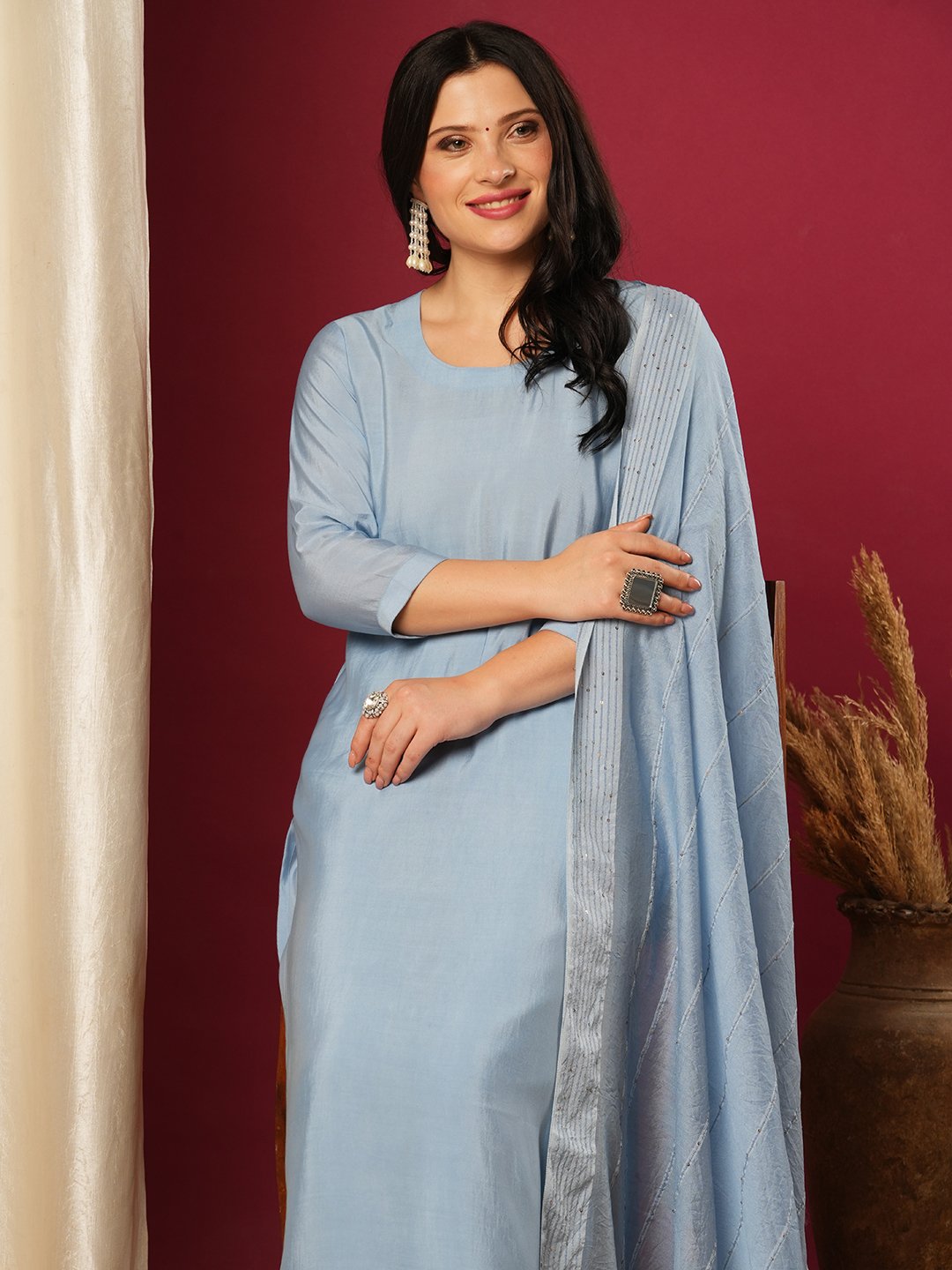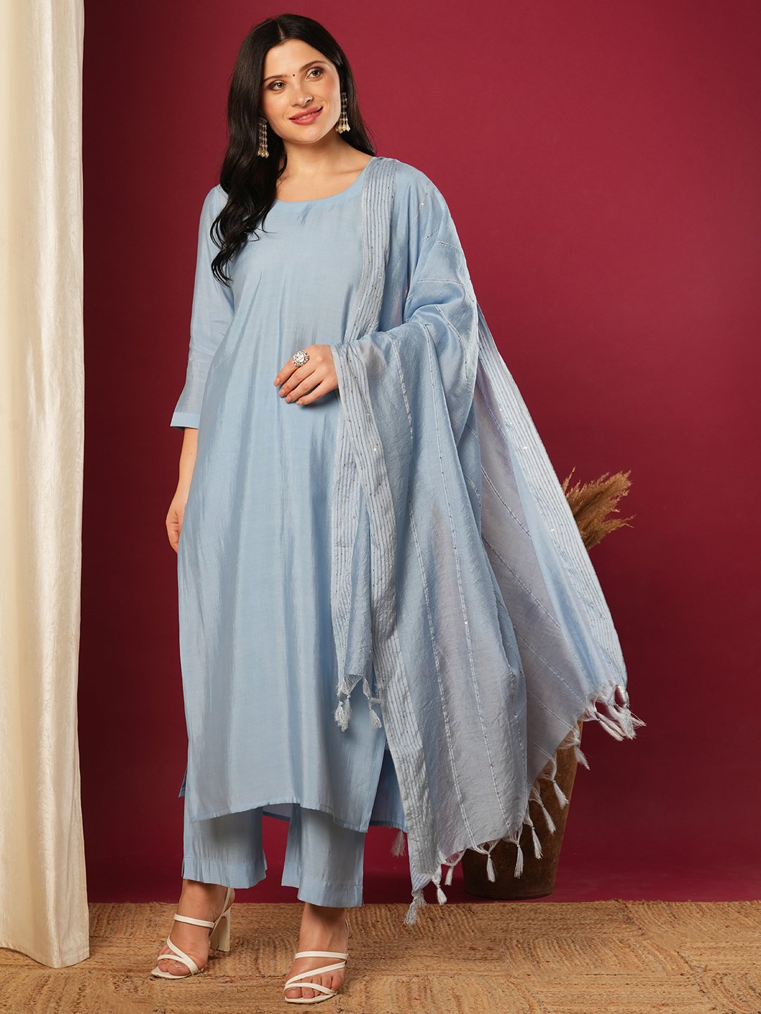 - This set includes: 1 Kurta and 1 Pant with Dupatta || Neck Style:- Round Neck.