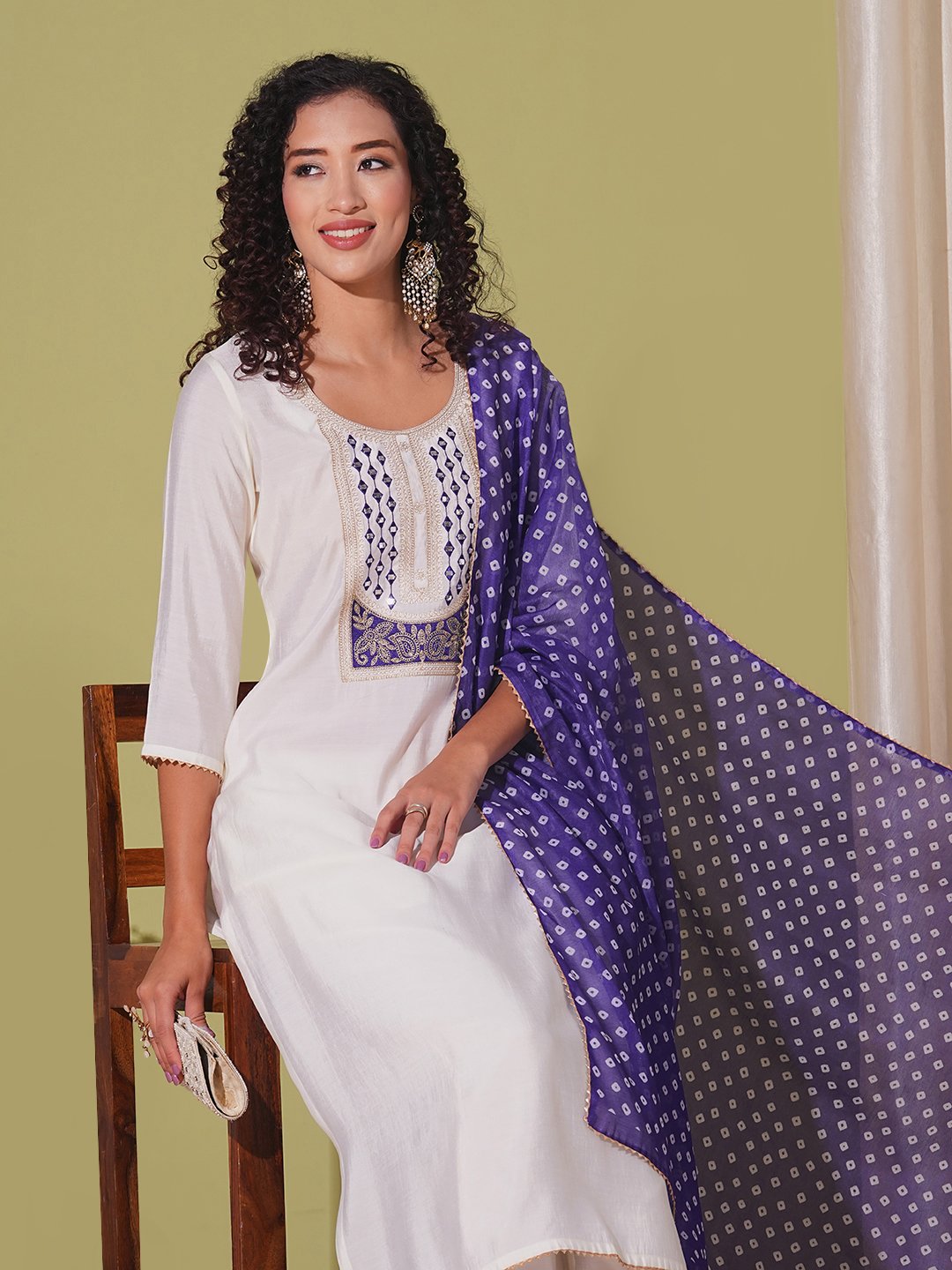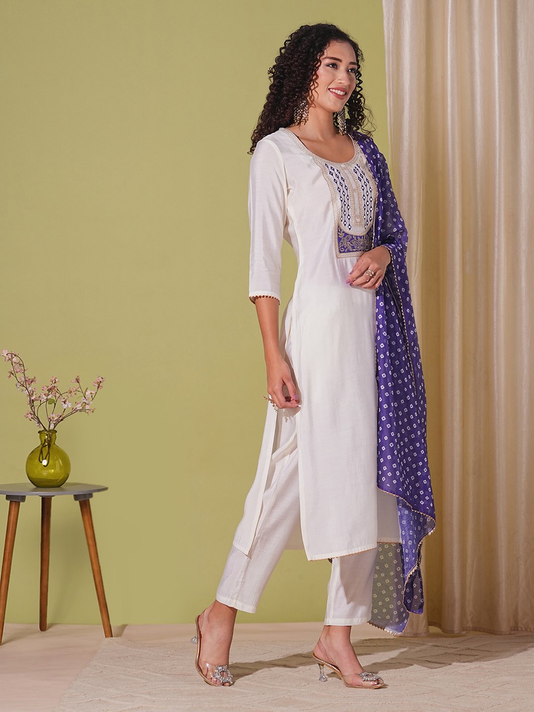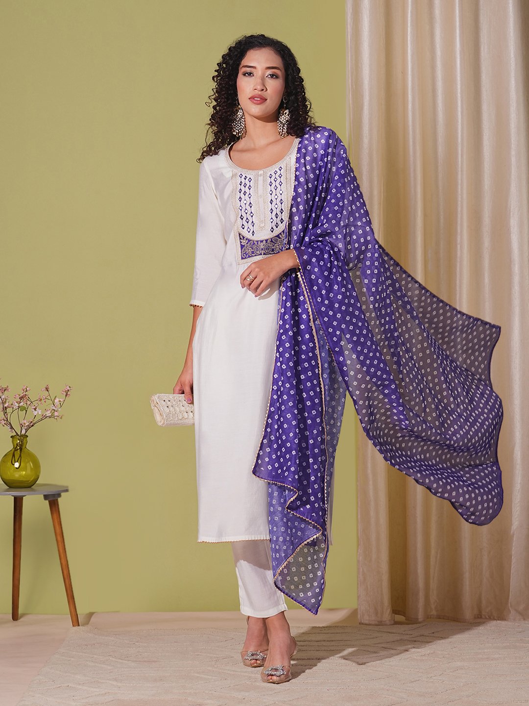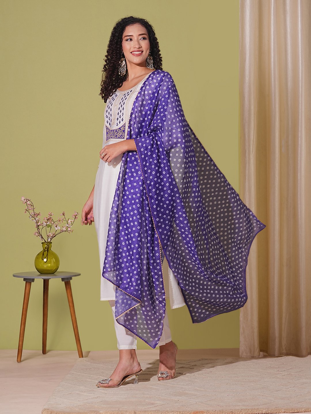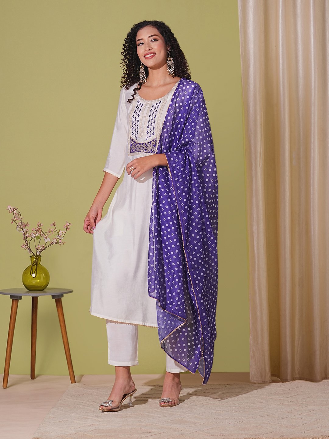 - This set includes: 1 Kurta and 1 Pant with Dupatta || Neck Style:- Round Neck.
