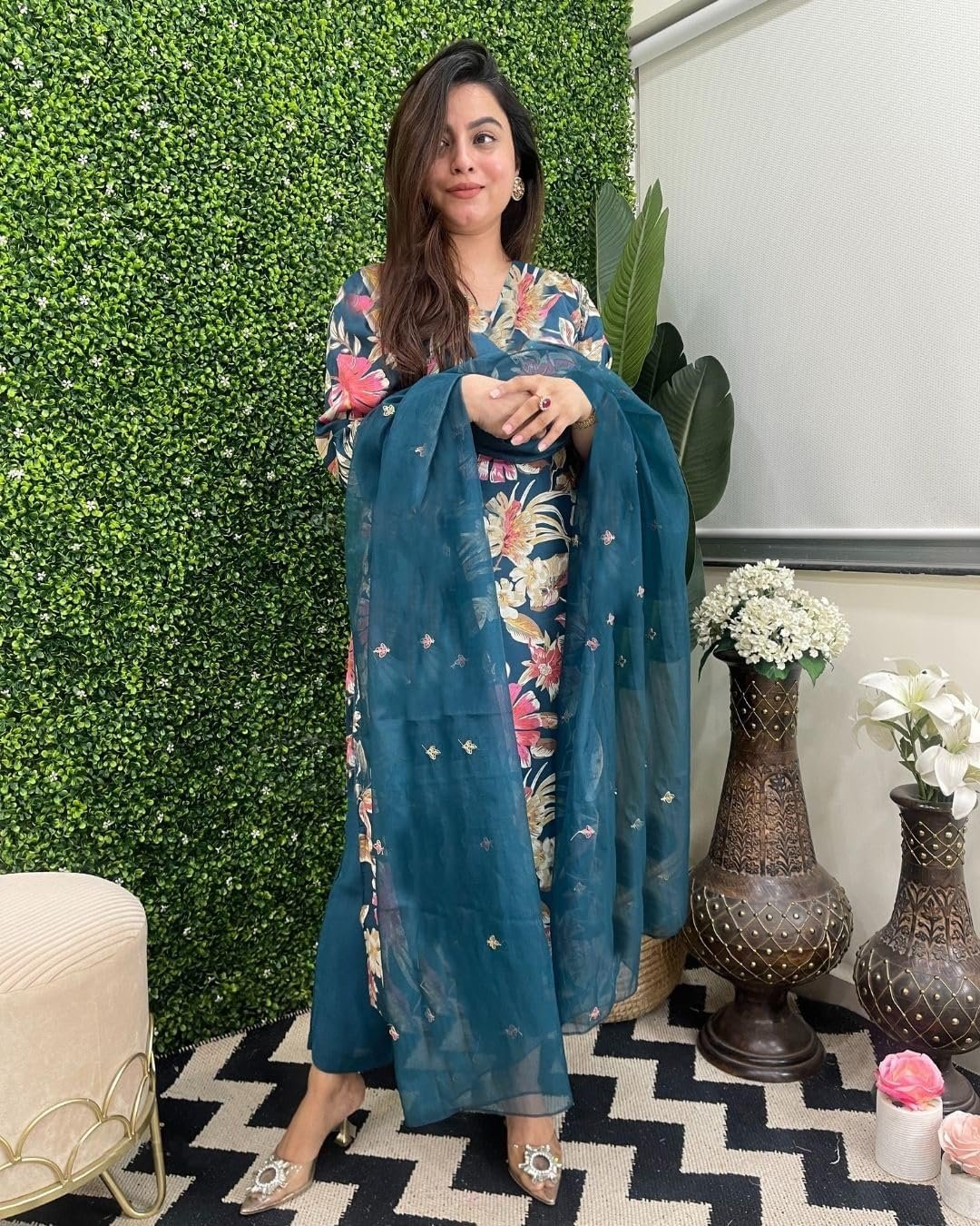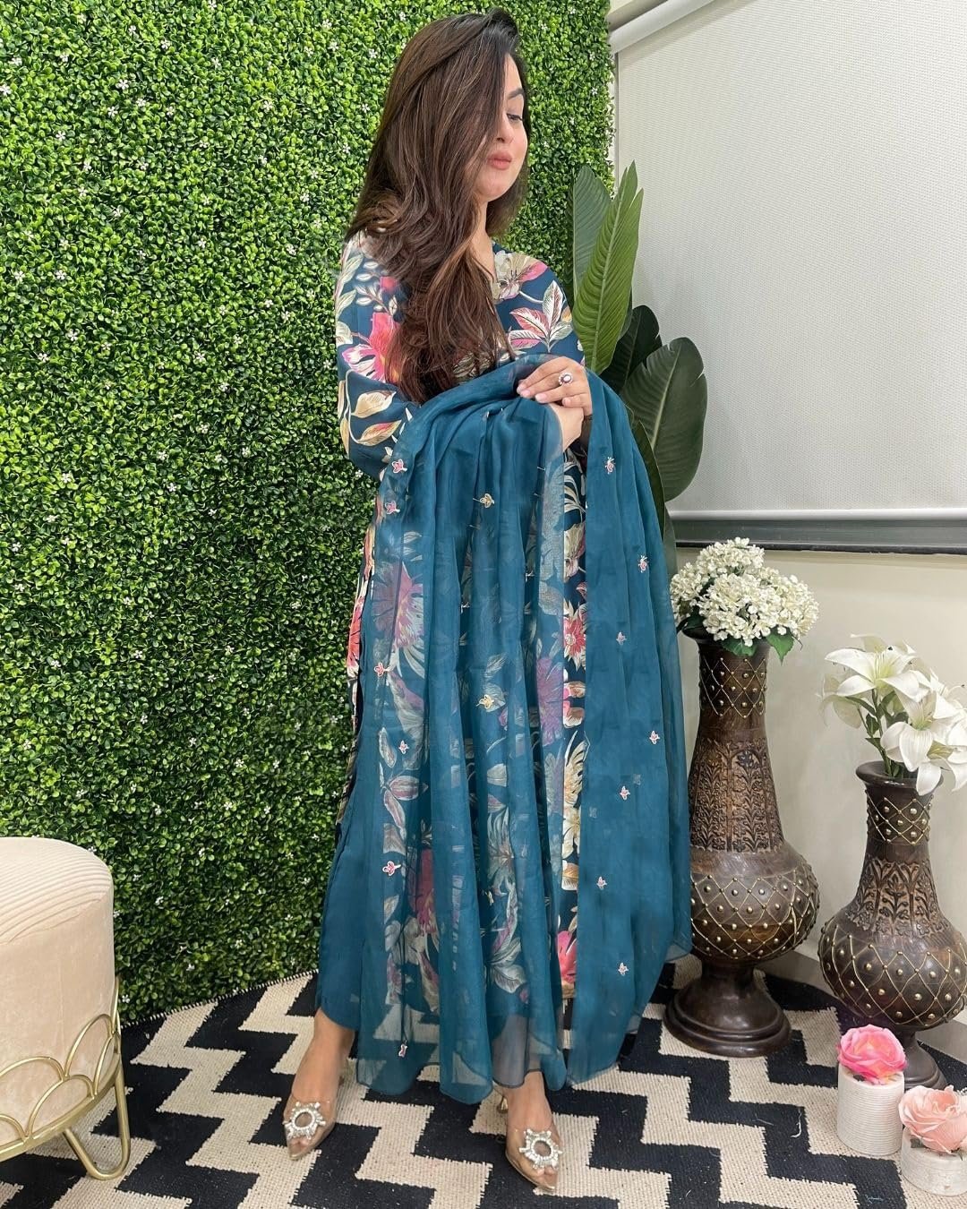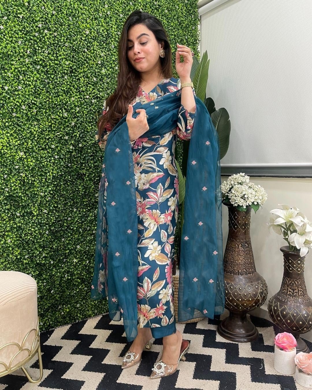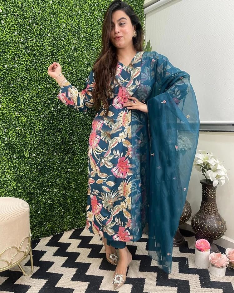 - This set includes: 1 Kurta and 1 Pant with Dupatta || Work :- Printed || Neck Style:- V-Neck
