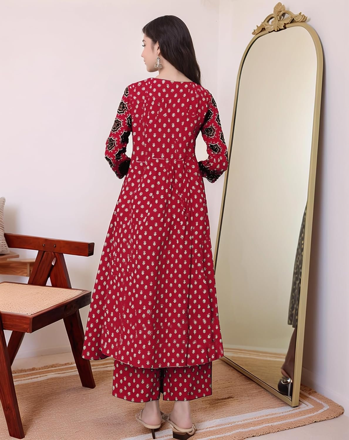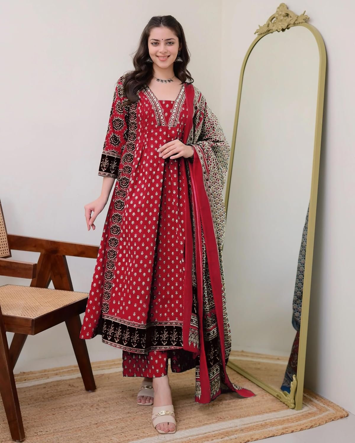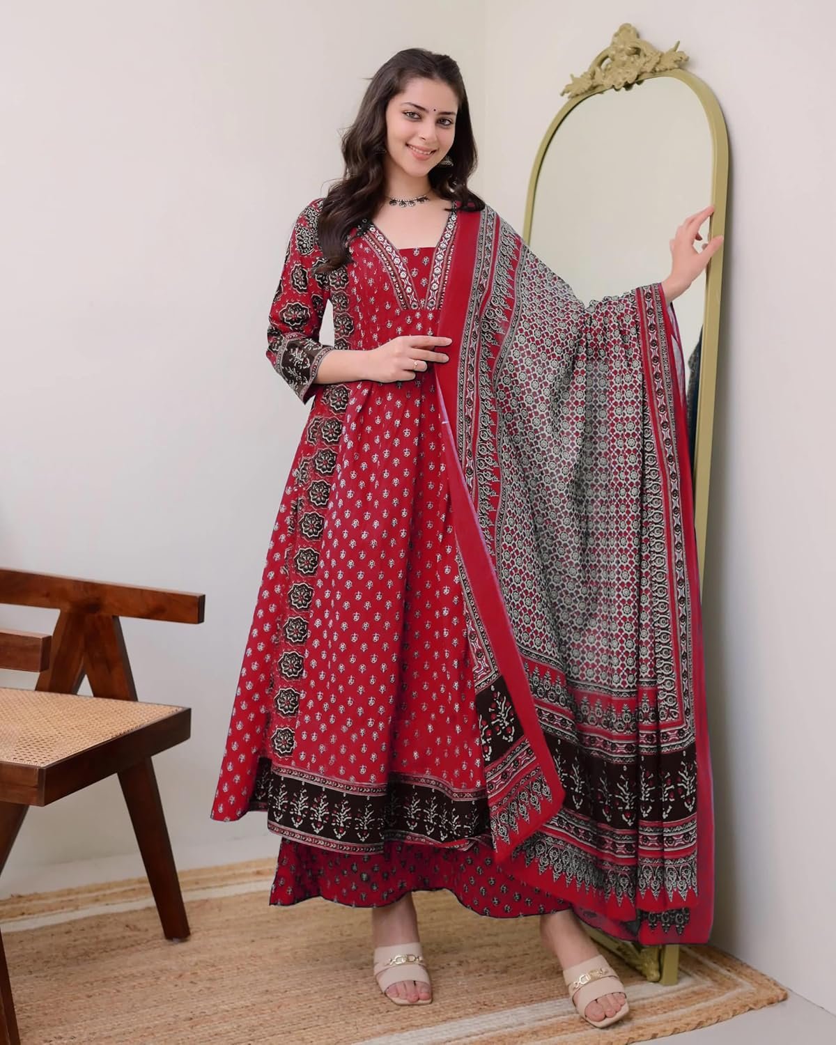 - 👗 Complete 3-Piece Ethnic Set: Includes a wine-colored Anarkali kurta, matching cotton palazzo, and a coordinated dupatta—perfect for effortless ethnic styling.