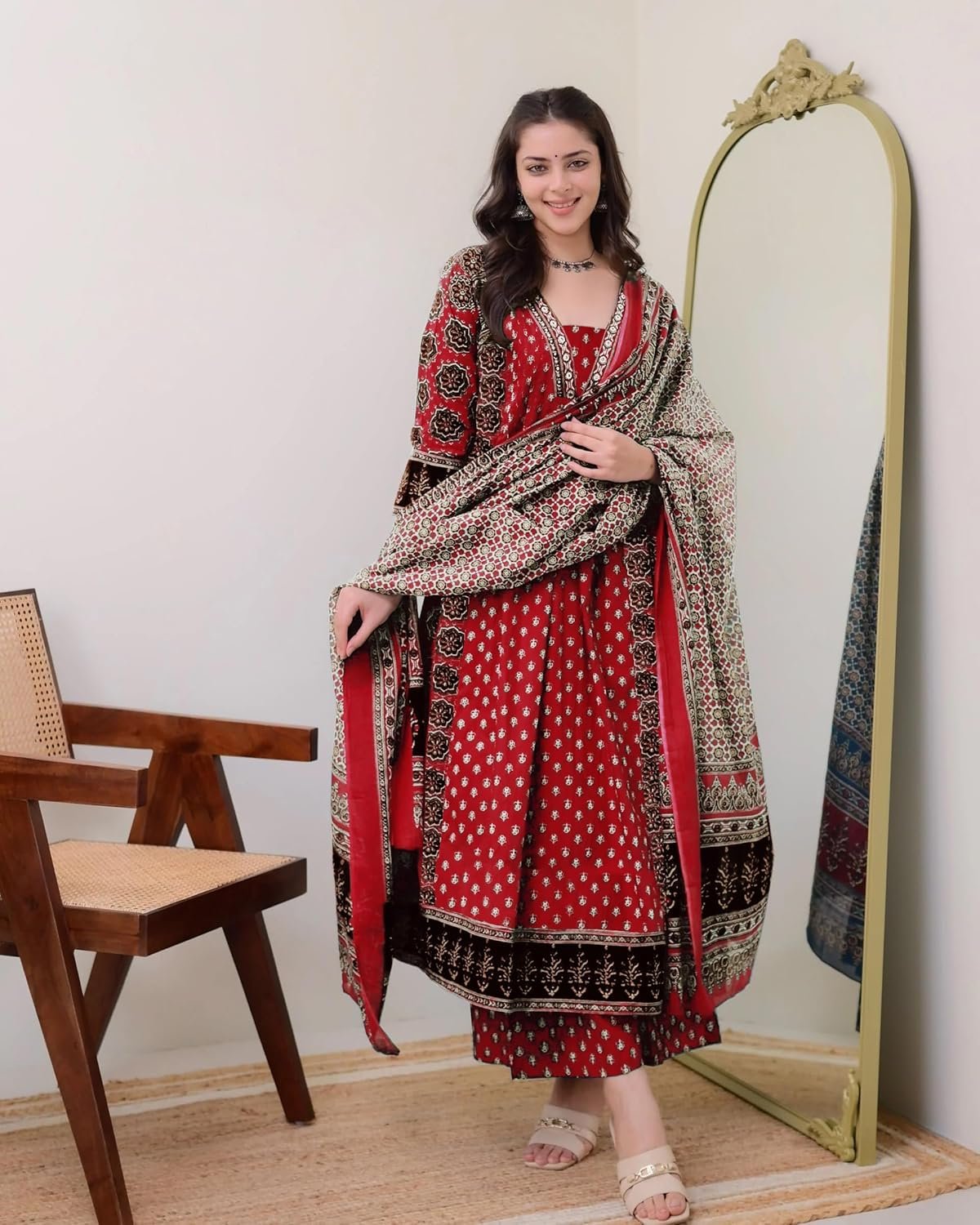 - 🌸 Elegant Anarkali Style with Ajrakh Print: This beautifully flared Anarkali kurta features authentic Ajrakh block prints, adding traditional charm to your festive & party wardrobe.