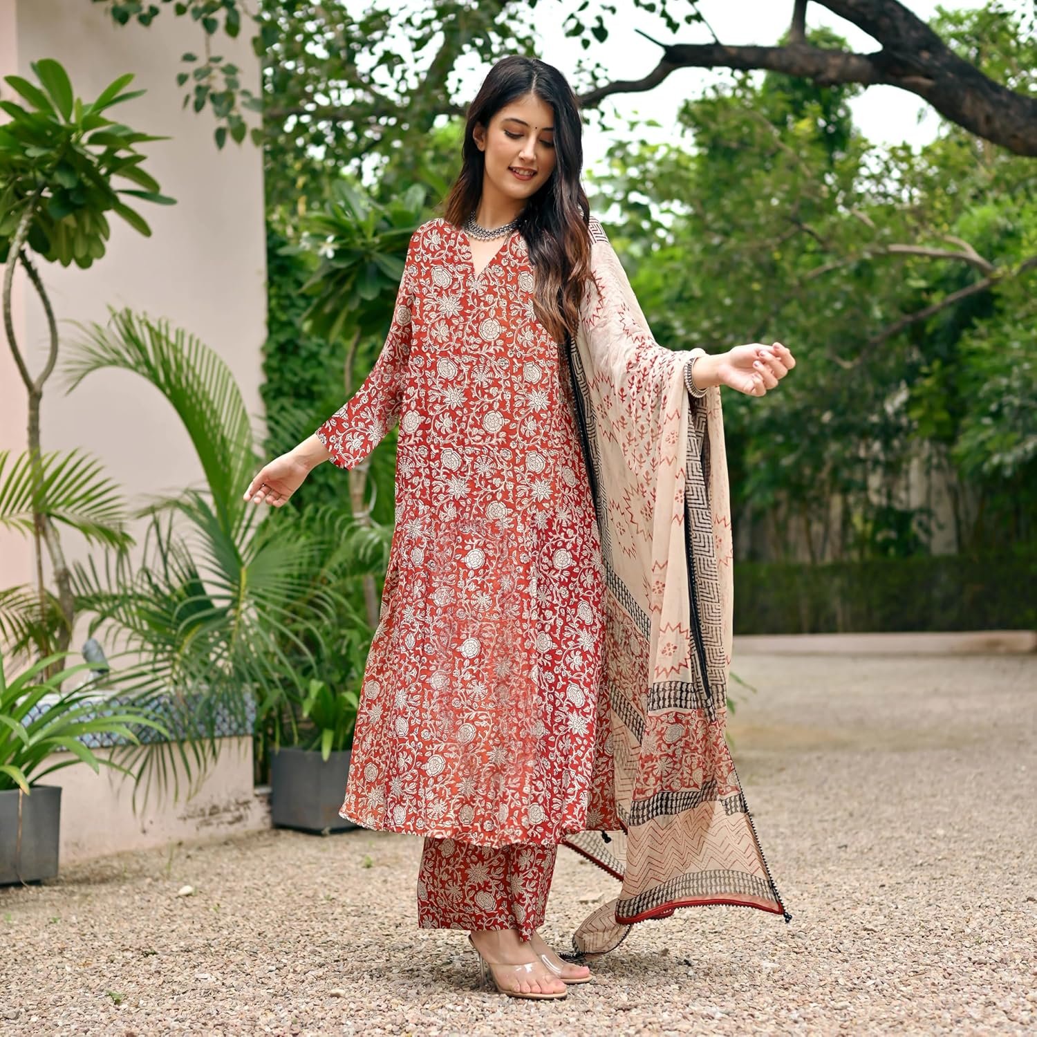 • This set includes: 1 Kurta and 1 Pant with Dupatta || Work :- Printed || Neck Style:- V-Neck ||Care instructions : Dry Clean Only