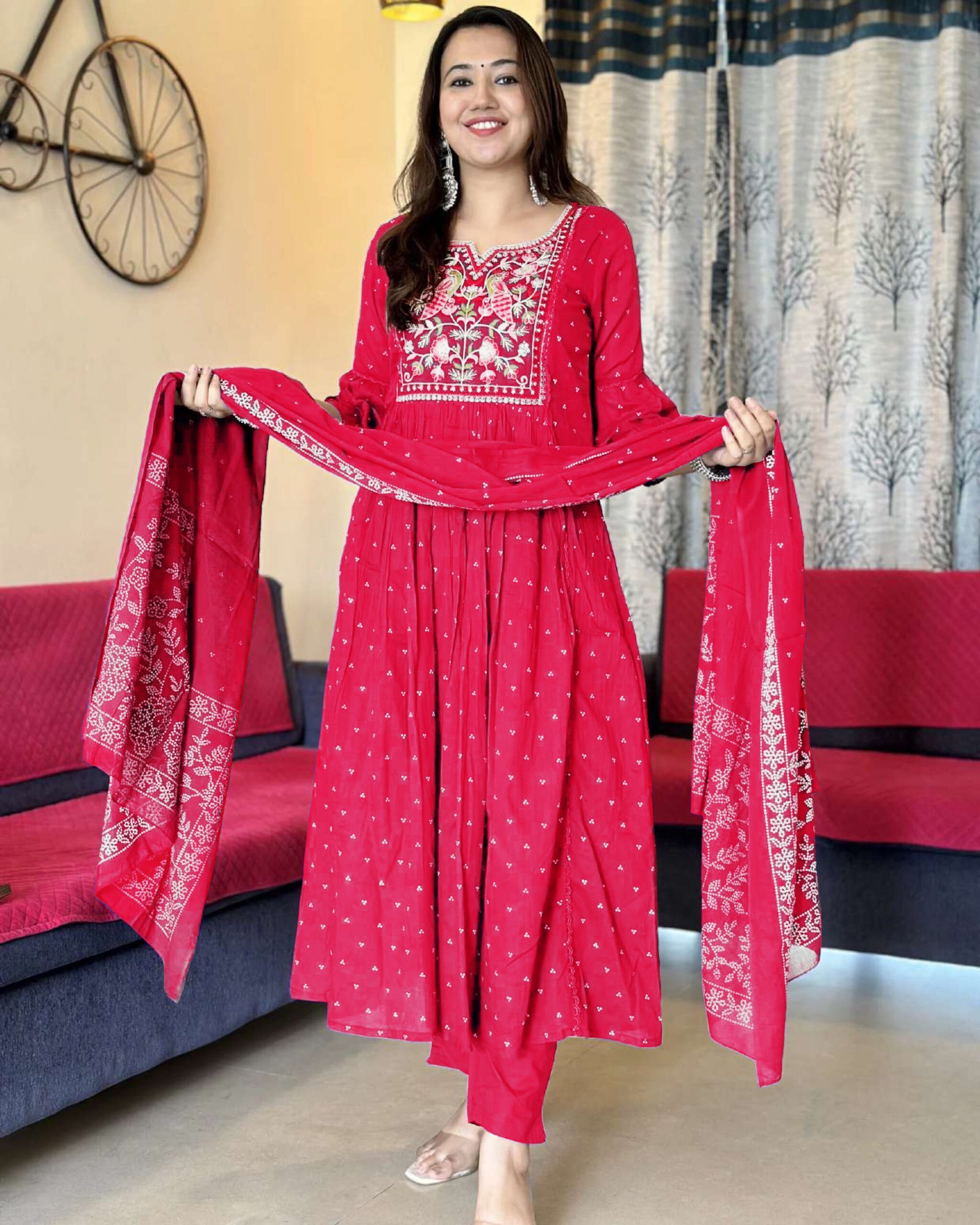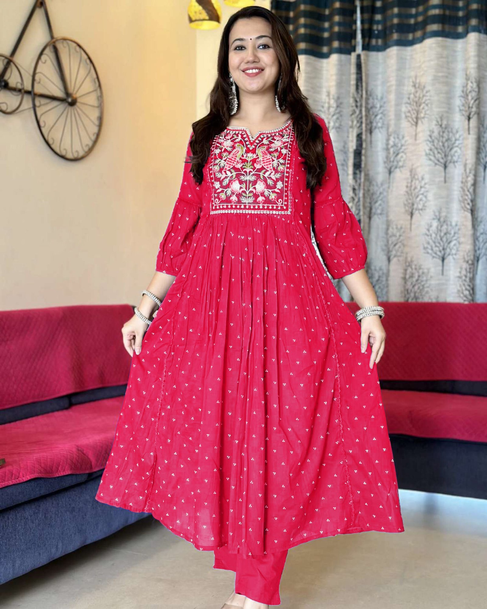- Style: Anarkali|| Length: Calf Length || Sleeves: 3/4 Sleeves || Size Chart- Kurta-S-36 in, M-38 in , L-40 in , XL-42 in , XXL-44 in || Pant :- S-28 in, M-30 in , L-32 in, XL- 34 in , XXL- 36 in, For More Please refer to the size Chart below.