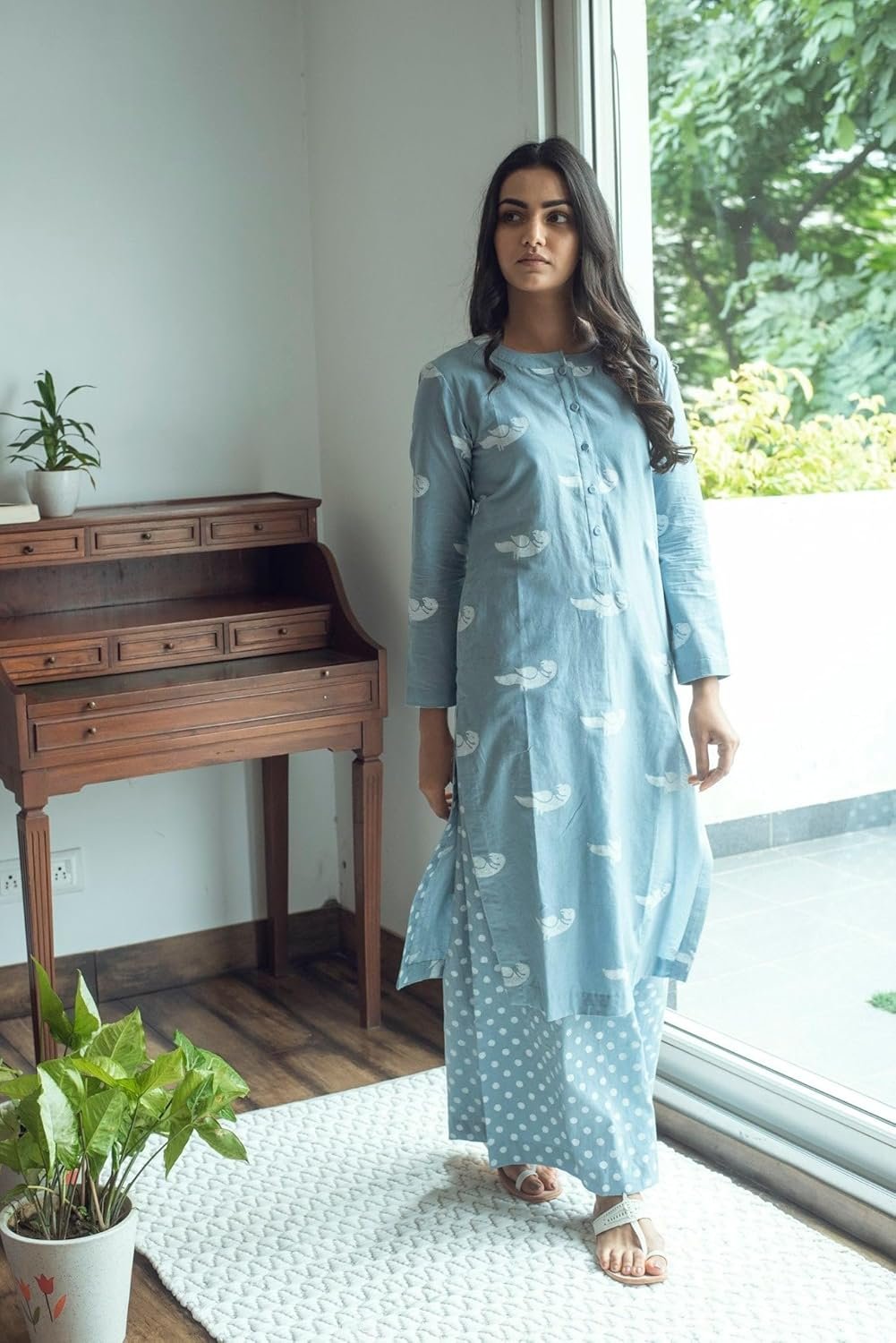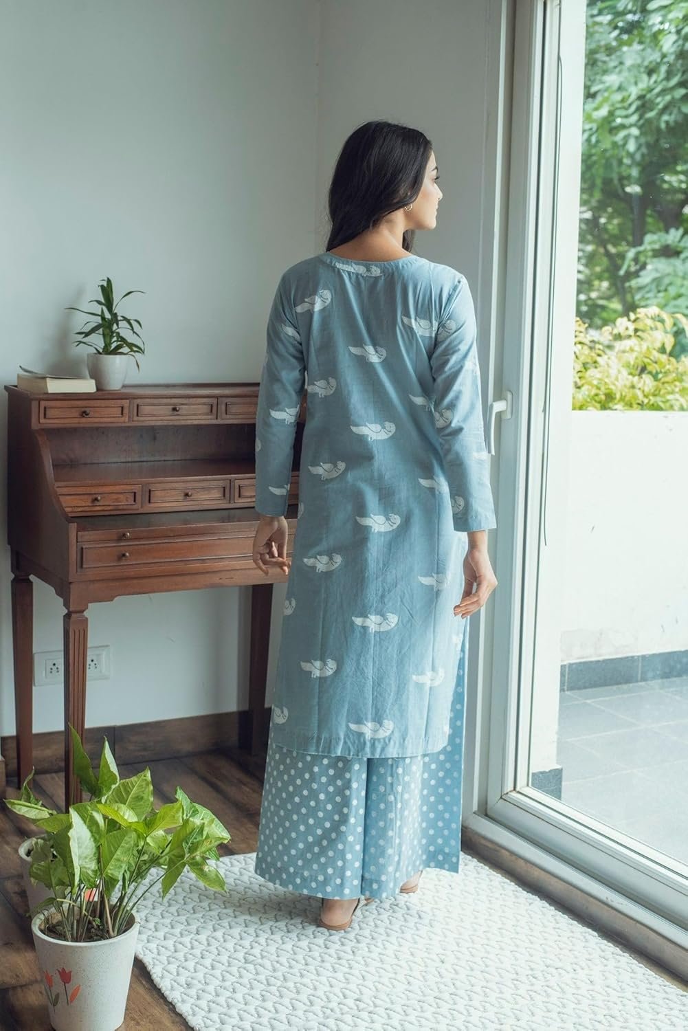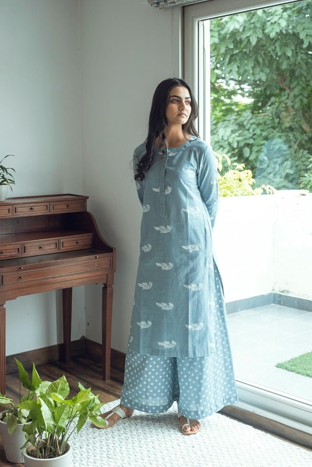 • This set includes 1 Kurta and 1 palazzo. Work: – Printed || Neck Style: High-Neck||Care instructions: Dry Clean Only