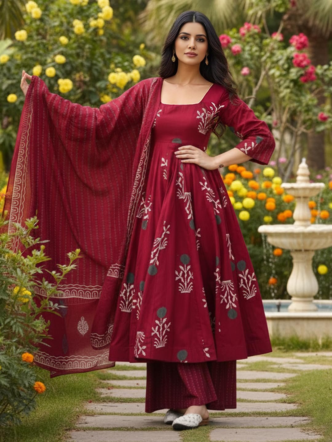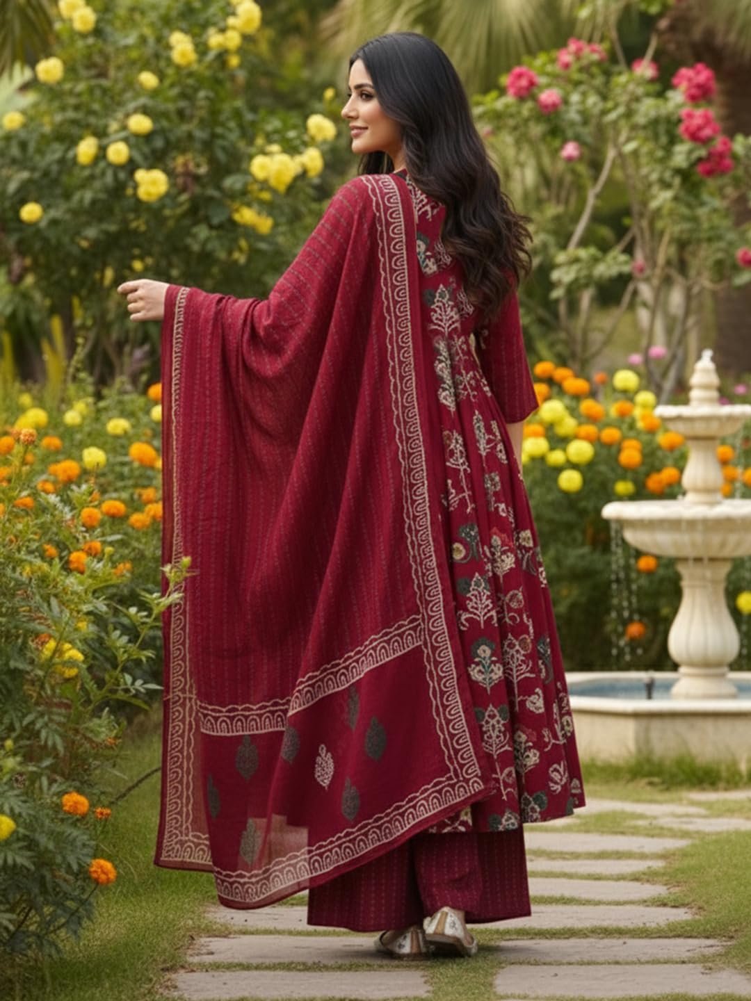 - Design & Pattern: An elegant printed Anarkali kurta with a graceful flare creates a flattering silhouette, paired with a stylish palazzo and a coordinated printed dupatta.