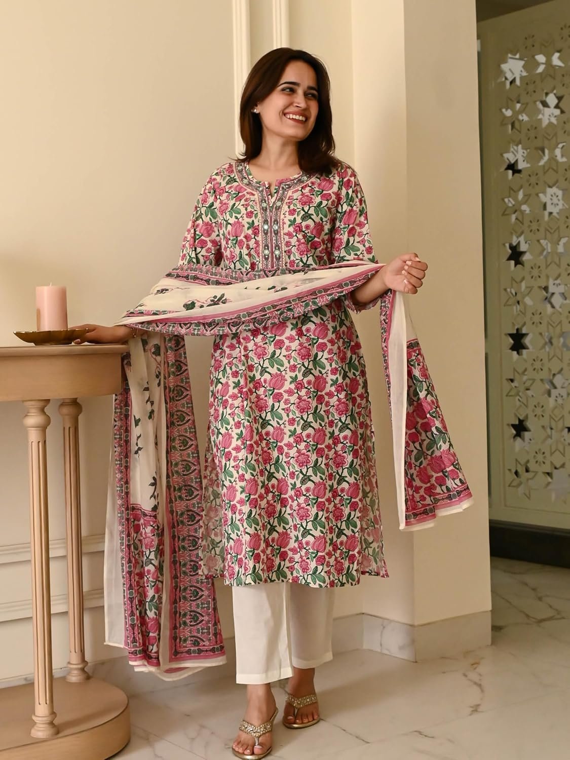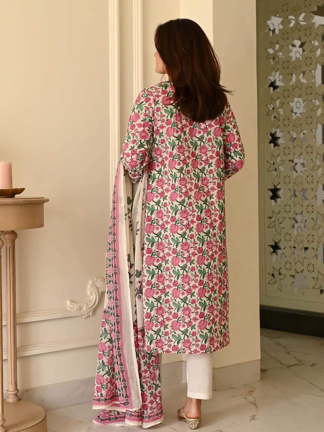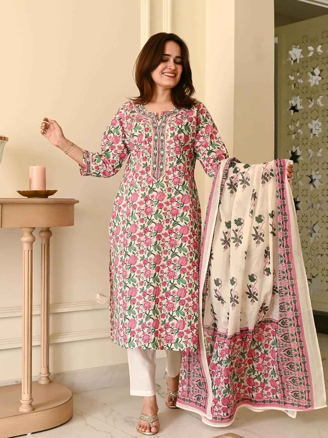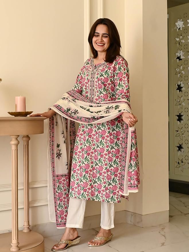 - This set includes 1 Kurta and 1 Pant with Dupatta || Work: – Printed || Neck Style: – V-Neck || Care instructions: Dry Clean Only