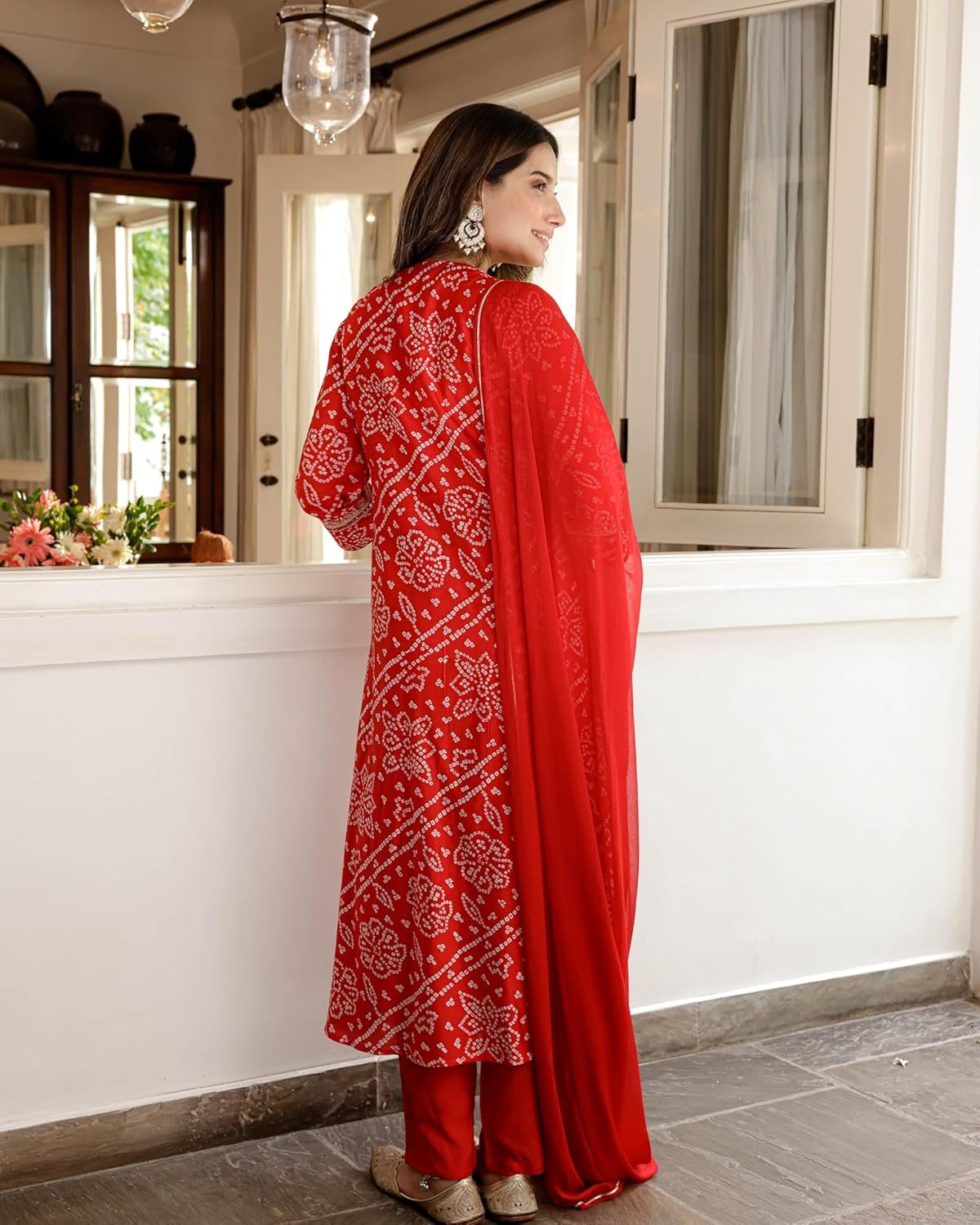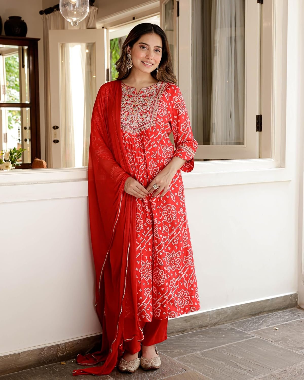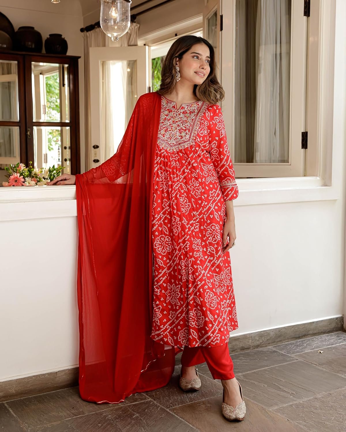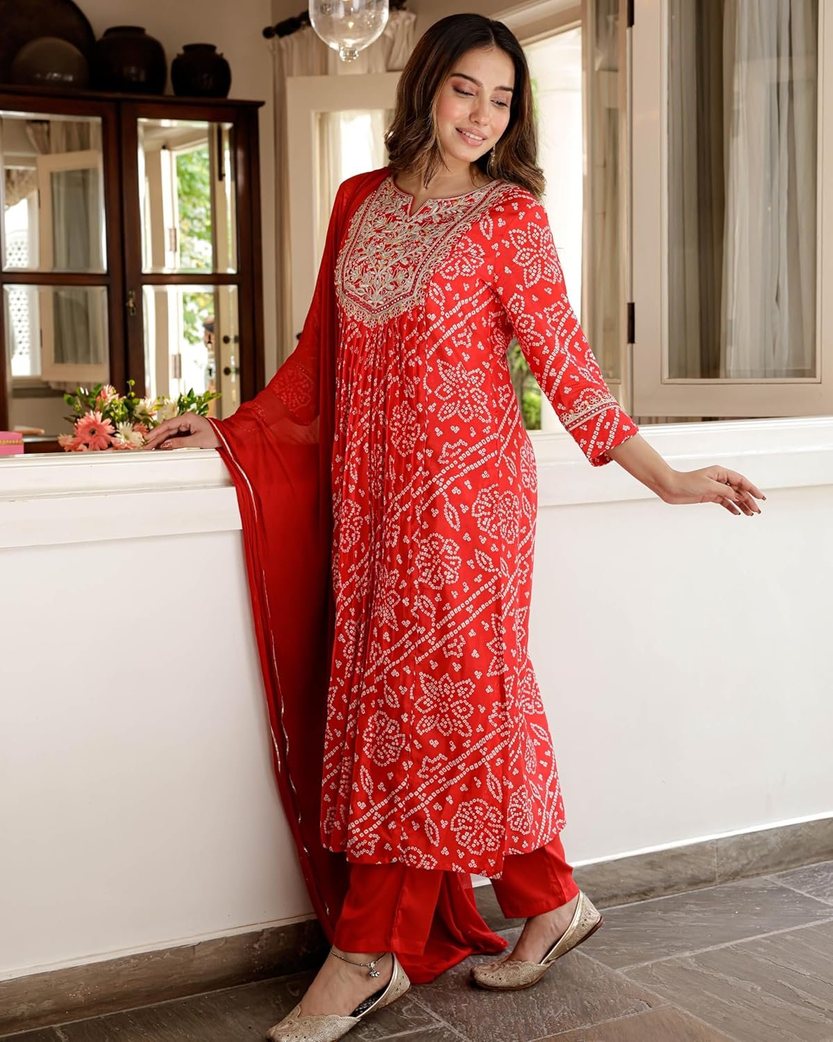 - This set includes 1 kurta, 1 pant with dupatta. || Work: Bandhej Printed & Neck Embroidery || Neck Style: V-Neck || Care instructions : Dry Clean Only