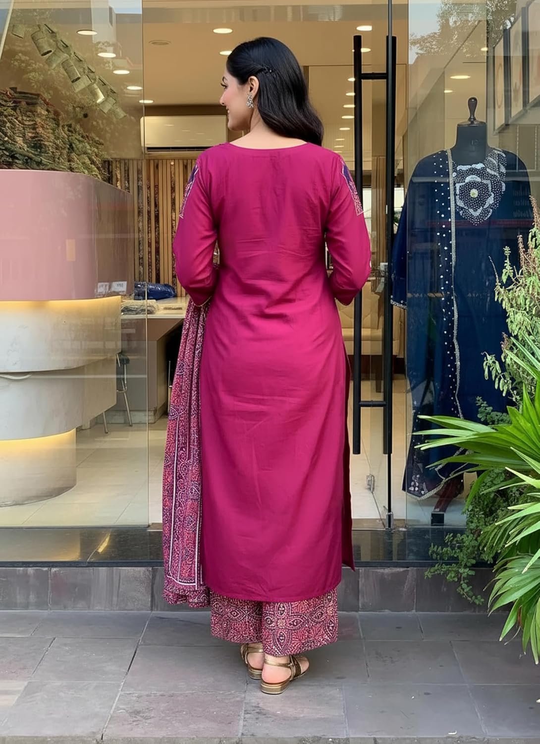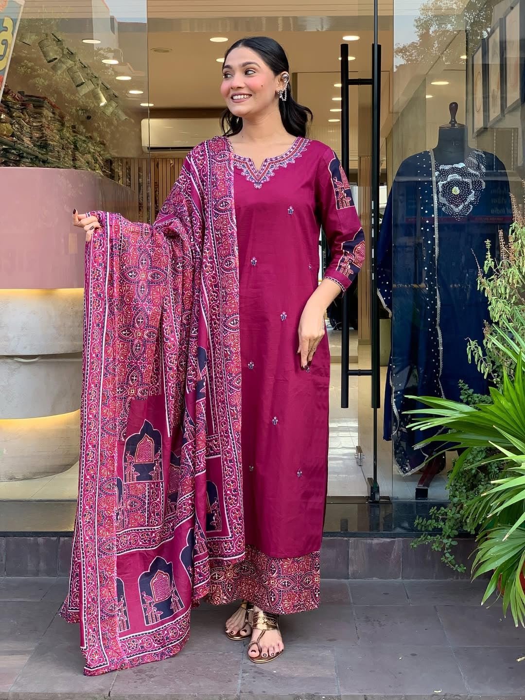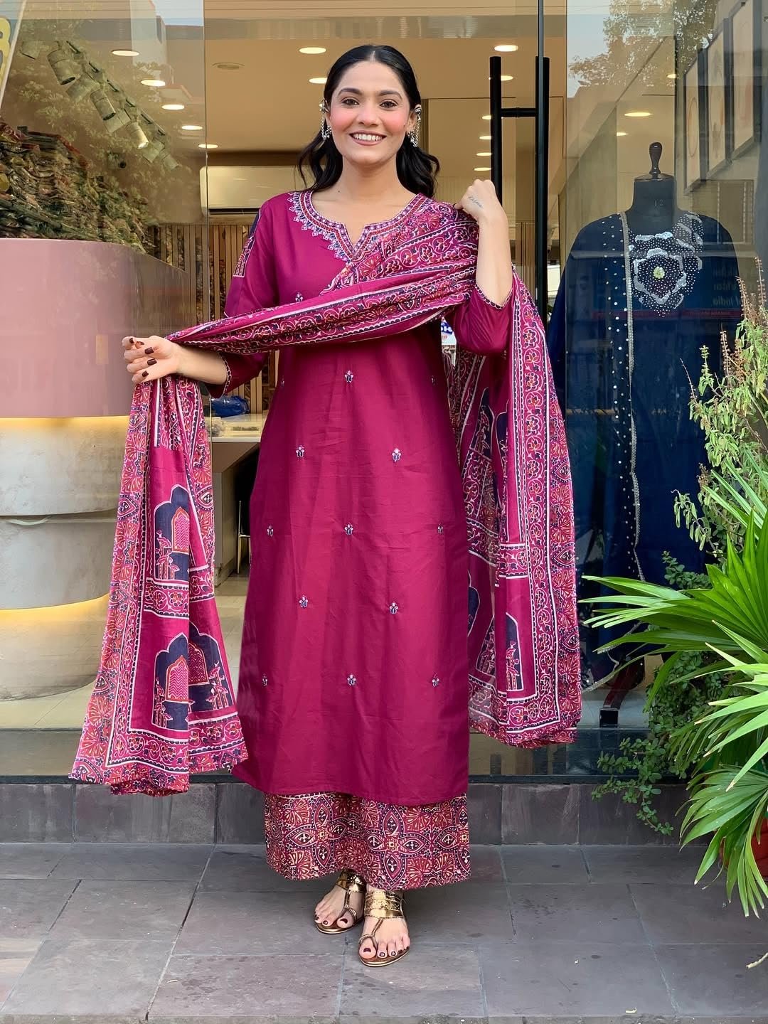 - This set includes 1 kurta and 1 palazzo with dupatta. Work: – Printed Embroidery || Neck Style: Round V-Neck