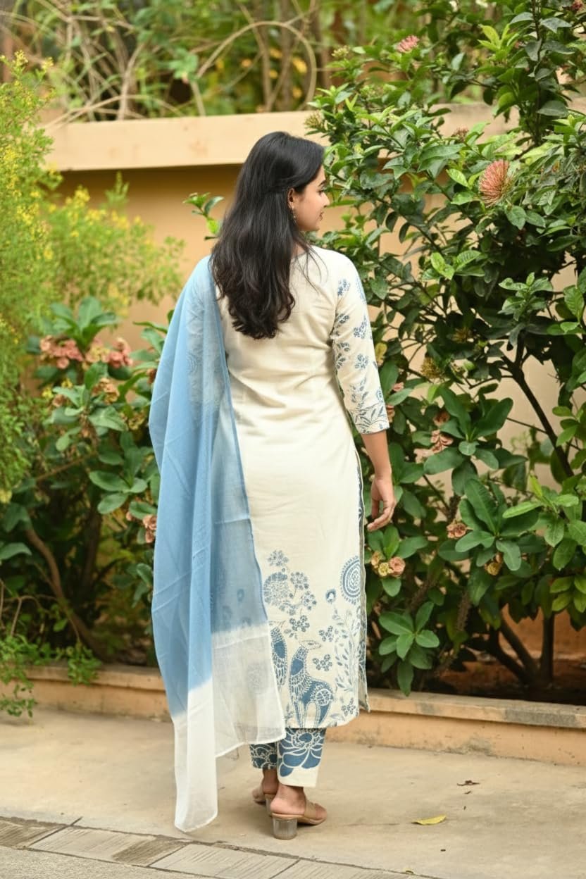 - Straight Kurta with Coordinated Set: Features a beautifully printed straight kurta paired with matching pant and complementing dupatta for a complete, well-balanced look