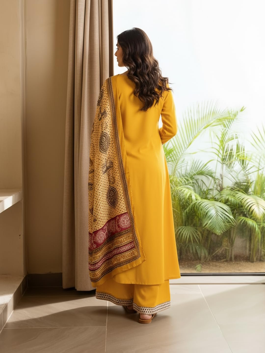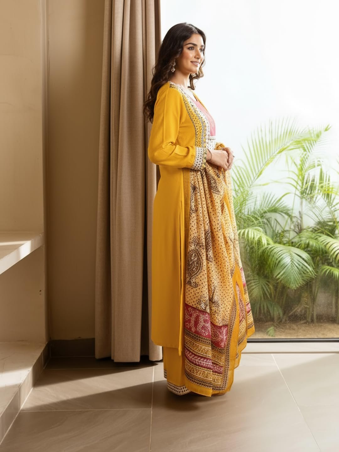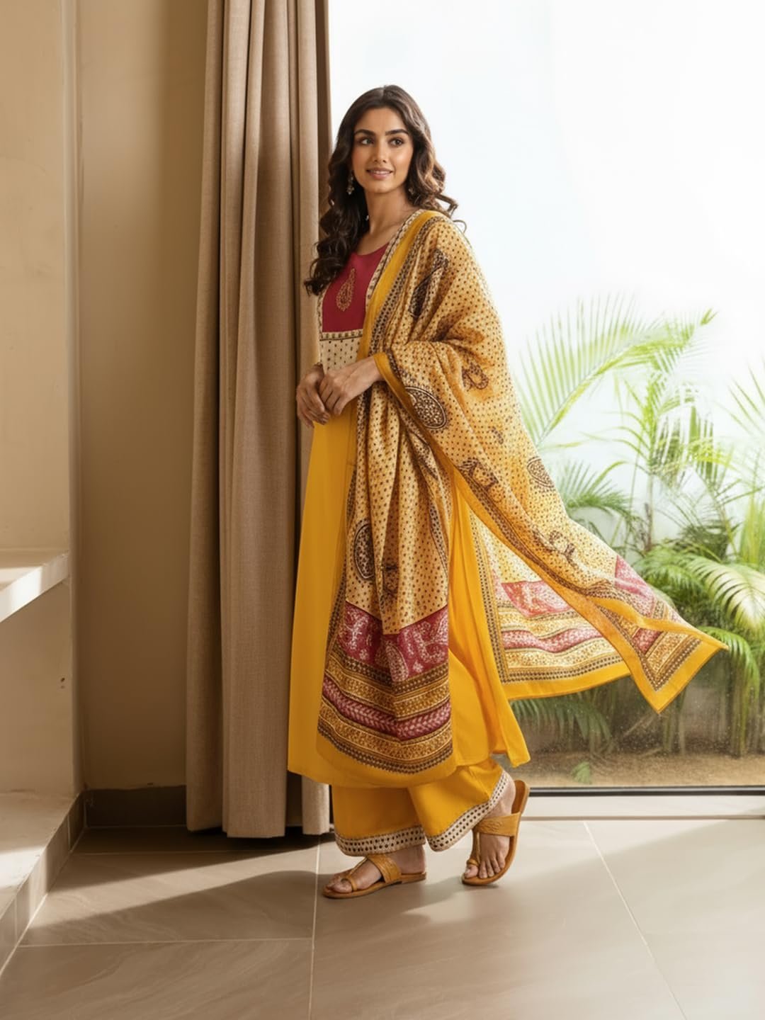 - Stylish Kurta Set—Women’s straight-fit kurta with matching palazzo & dupatta, perfect for a complete ethnic look.