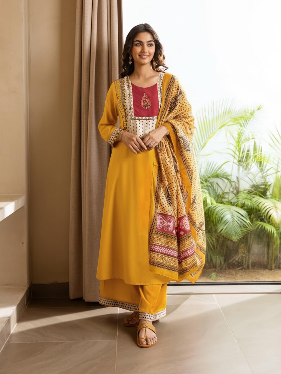 - Comfortable Fit—Designed for Indian body types, available in multiple sizes; package includes kurta, palazzo & dupatta.